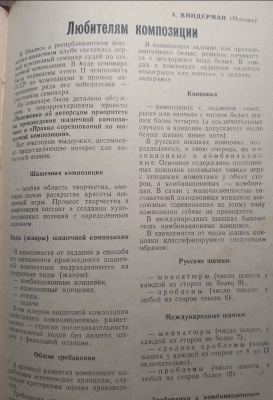 Здесь надо иметь ввиду, что "Шашечный кодекс СССР", который ВПЕРВЫЕ вспомнил о композиции появился только в 1986-м году. И, получается, что до этого "Правил композиции" вообще не было. Были только "понятия", которые не совпадали у разных групп композиторов. С учетом же того, что в "датском королевстве" никогда не было спокойно, разногласия и ссоры сопровождали большую часть соревнований. И чем выше по рангу были эти соревнования, тем ожесточеннее они были. "Центр" позволял себе заниматься евгеникой в композиции, ничем не обосновывая свои действия, или же обосновывая их "хотелками" судейского корпуса. Периферия говорит: "Оцениваем", а "центр" говорит: "Нет"...