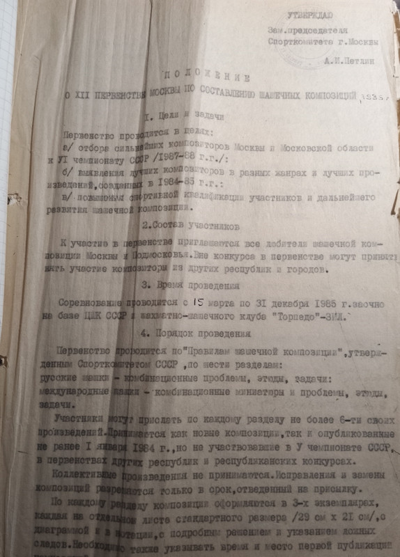 И вот "судья" А.Фомин - спустя 40 (!!!) лет - показал один листок Регламента (будет ли храниться... - https://i.postimg.cc/XNFSmqzY/IMG-20250 ... 22-714.jpg ), в котором НИЧЕГО не говорится о допустимых нижних пределах количества белых шашек. А упоминание о том, что Первенство проводится "по утвержденным Правилам шашечной композиции" тоже ФАЛЬШИВОЕ, так как в 1985-м году НИКТО этих "утвержденных" правил не видел.