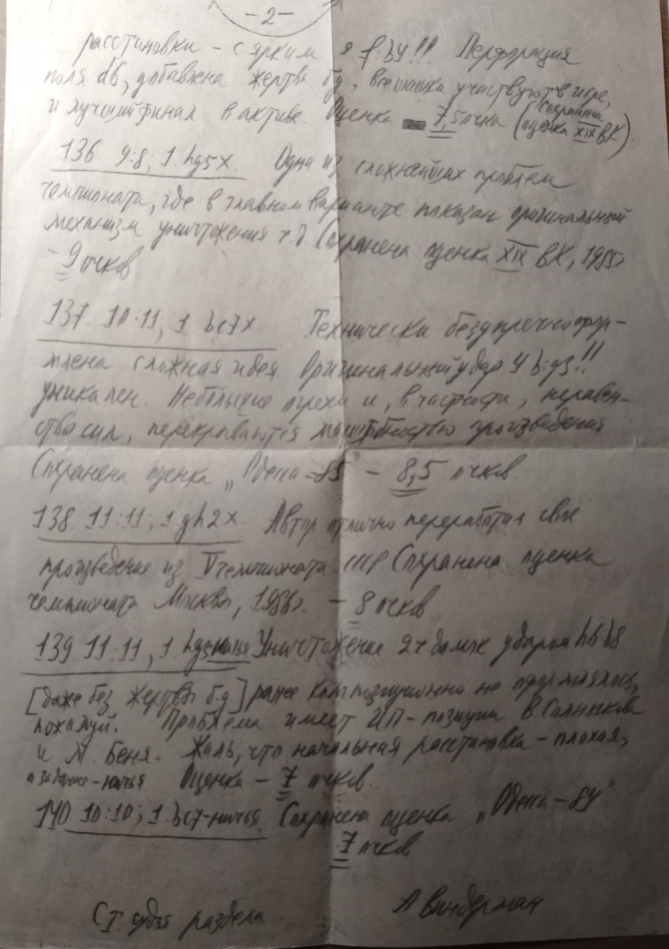 "The complex idea is technically flawlessly executed. The blow 4.b:g3 is unique! Minor flaws, in particular the inequality of forces of the parties, are compensated by the scale of the work. The score of the contest Odessa 1985 8.5 points. has been preserved", - A. Vinderman This score caused panic on the part of the chief judge of the 7th USSR championship A. Fedoruk, who reduced this score by half a point and gave a score of 8 points in the cchampionship's finale "round".-comment by author of this article .