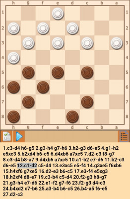 1.ba3 2.ab4 3.ab2 4.gh2 5.g:e7 6.h:g3 cd6 7.g:c7 b:d6 8.hg3 ed2 dc5 a 9.c:e3 dc5 10.gf4 e;g5 12.h:f6 cd4 13. cd2 x