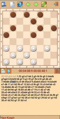ed6 (de1), dc7 (b:d6), de5 (f:d4), e:e7 (g:g1), ed8 (h:f2), de7 (f:d6), h:b4 (a:c3), cd2(cb2), a:c3 x