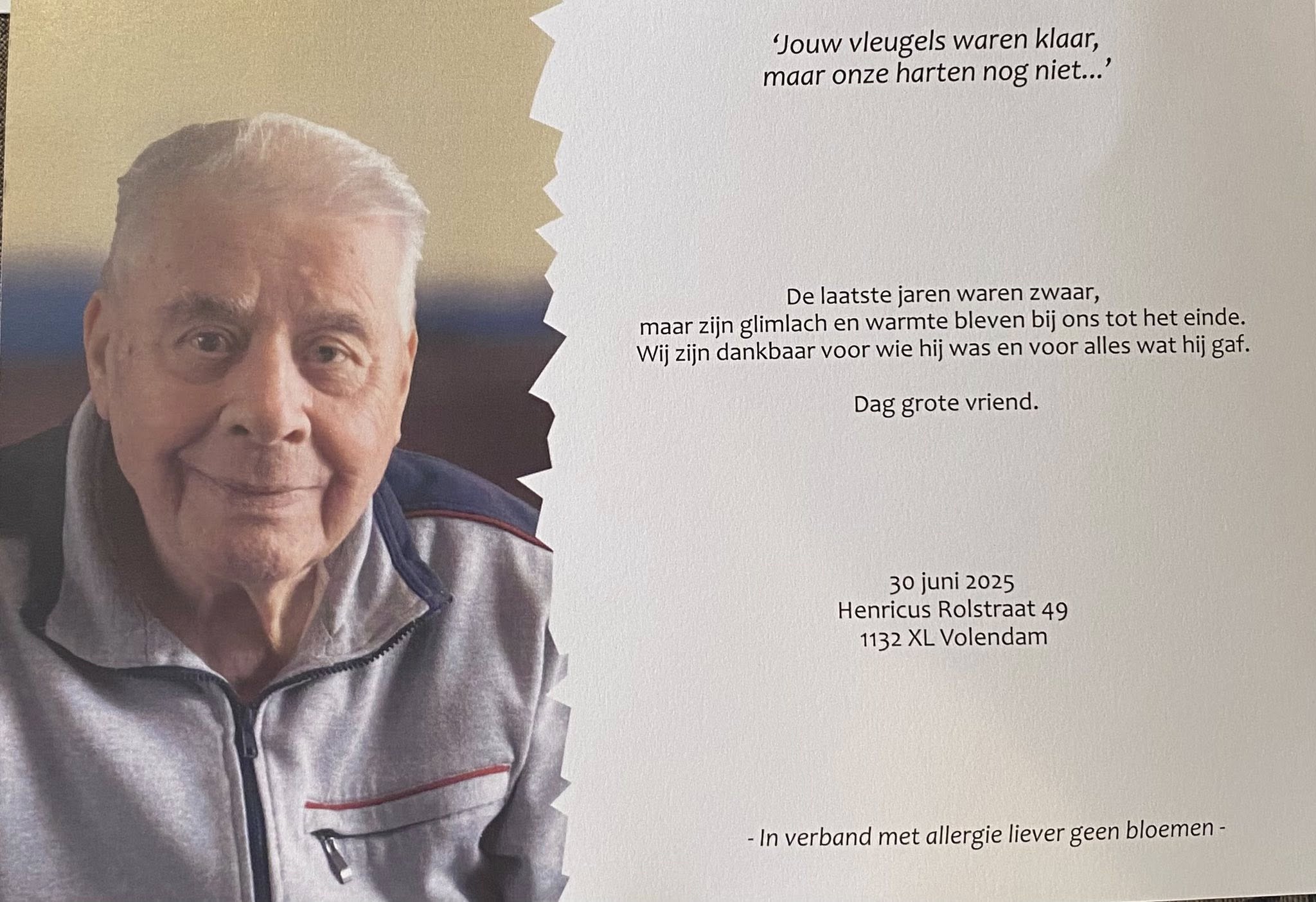 Na een korte periode van afnemende gezondheid is op 86-jarige leeftijd onze hoofdsponsor overleden. Zijn vrouw Gerda was nog maar kort geleden op 17 juli 2025 overleden.