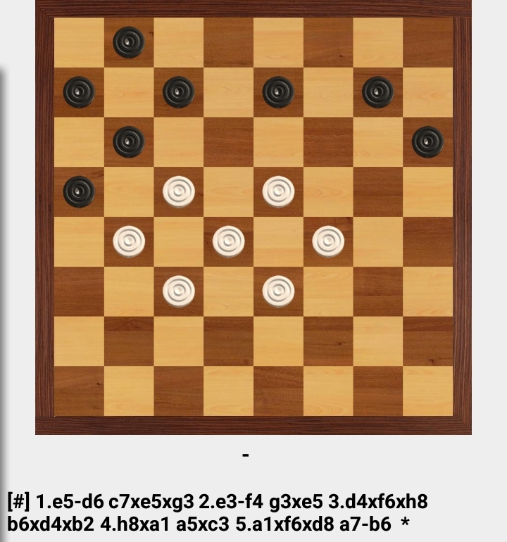 Side solution - 1.bc5 b:d4 ( 1...d:b4 2.f:d2 b:d4 3.dc7 f:b8 4.g:e7 d:f6 5.dc3 b:d2 6.e:g7 h:f6 7.g:e1 x ) 2.c:g7 h:f6 3.e:c3 fg1 4.f:d2 gh2 ( 4...ga7 5.cb4 ab8 6.gf4 b:h2 7.ba5 f:d6 8.g:c5 x ) 5.gh6 h2:b8 6.e:g5 bh2 7.gf6 hf4 8.cb4 f:g5 9.h:f6 x[/color]