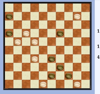 The initial placement of checkers in this composition is characterized by the words of the poet: extracting from the garbage waste samples of scary-faced crafts, obedient for the hack's man priests impose this hackwork to people.