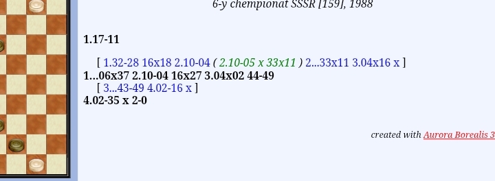 I 1.hg3 ? fg7 2.h:d6 c:e7 3.a:c5 b:f6 4.ef4 ed6 [далее у "аналитика" несуществующая игра, выигрывает же за белых fg5+]5.gf4 dc5 6.d:b6 a:c5 7.fe3 cb4 8.ed2 fe5 ! 9.f:d6 hg3 10.dc7 gh2 11.cb8 bc3 12.d:b4 hg1 ef4 13.gd4 =