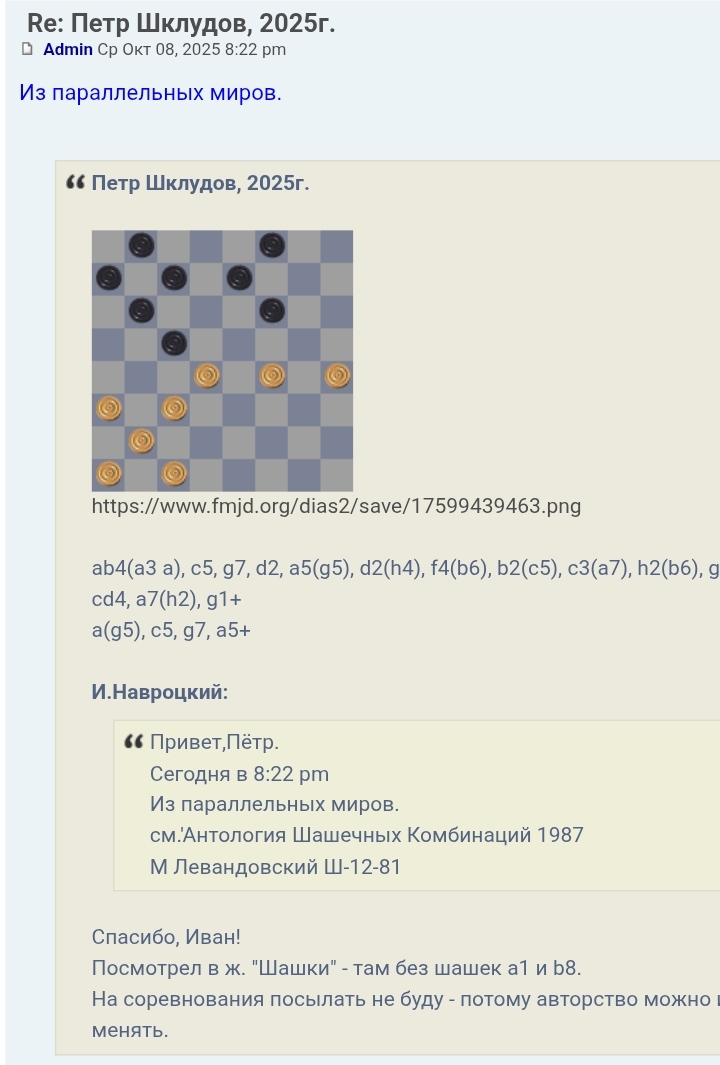 Almost 5 years ago, on February 26, 2021, the author of this post posted an original approach to an old etude motif (see position in diagram No. 2) on the WDF forum. Without thinking twice, the plagiarist Shkludov changed the first move in the introduction to the author's " problema " and brazenly attributed the resulting variation to himself. The deceased now, unfortunately, Russian champion on composituons in " etudies -64 " Alligrant Aleksandrovich Lukyarov, assisted the author in choosing a preventive measure against the thief, P. Shkludov. He posted on the Myth forum, on behalf of A. Fomin, the position in diagram No. 1, illegally attributed by the plagiarist in favour for himself . Despite this, even 5 years later, the thief continues to try to convince viewers of his alleged copyright in someone else's work. Isn't it time to impeach the swindler , who sent a letter by the "Tsar of composition S. Khottabychev " letter to the FMJD lidership. to recommend in 2015 make a lifetime disqualification towards President of Russian draughts federation Anatoly Nikitin?