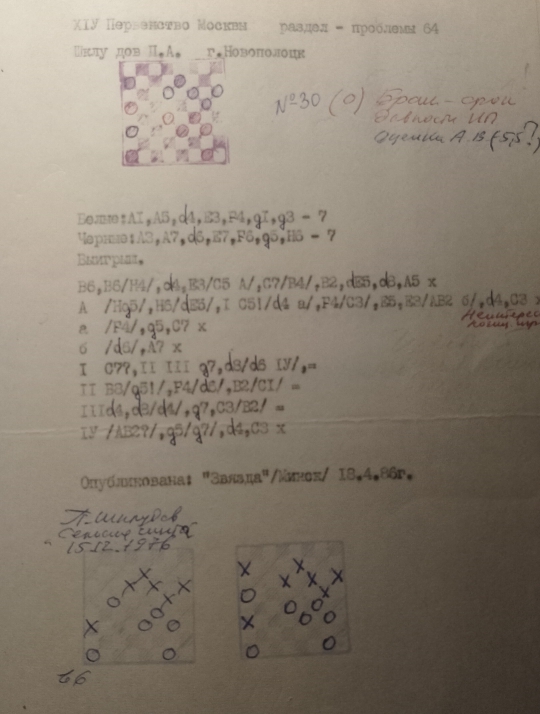 " Dear comrade Shkludov P. A.! I am informing you of the preliminary results: No. 30 7:7 1.ab6 x is generally a good practical "problem'".It's a pity that the introduction does not contain a combination nature. Complication of the author's position from a "rural newspaper" , Minsk dated December 15, 1976. If the ideological predecessor did not participate in the competition, then the score is 5.5 points. " And Fedoruk comments: 5.5 (??) It should be rejected due to the statute of limitations, there is nothing new! , signature (A. Fedoruk ) Main chief A. Fedoruk wrote : The "problema" is rejected due to the expiration date of the ideological predecessor. A score by A. Vindreman is 5,5 points (??)