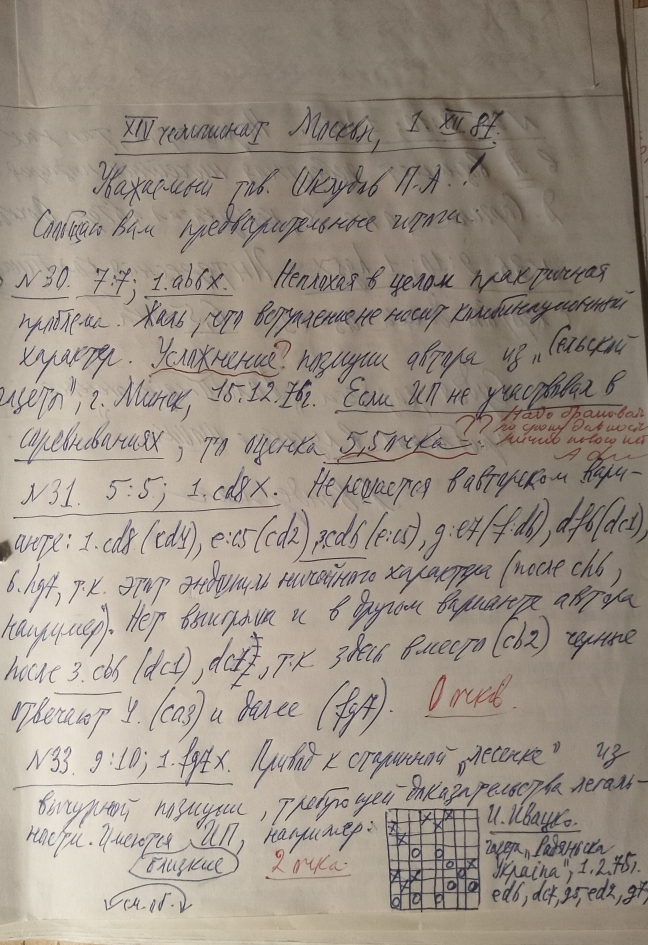 " Dear comrade Shkludov P. A.! I am informing you of the preliminary results: No. 30 7:7 1.ab6 x is generally a good practical "problem'".It's a pity that the introduction does not contain a combination nature. Complication of the author's position from a "rural newspaper" , Minsk dated December 15, 1976. If the ideological predecessor did not participate in the competition, then the score is 5.5 points. Main chief A. Fedoruk writes a comment to the author's paper variant of a letter : it does not meet the publication deadlines, it must be rejected!.