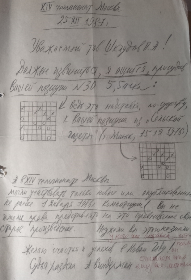 . Dear Comrade Shkludov! I must apologize, I was mistaken in judging your position No. 30 5.5 points: After all, this is essentially a " superstructure" to problem from the Rural Newspaper, Minsk, dated 15.12.1976. And in the 14th Moscow Championship, only new compositions or those published no earlier than 1 January 1986 could participate (You did not have the right to submit the old work to the competition. Didn't you know this? I wish you success in the New Year. Judge A. Vinderman, December, of 25 ,1987).