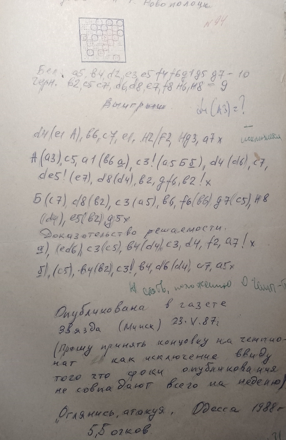 After an unsuccessful attempt to deceive the judges of the 14th Moscow Championship in 1987, when P. Shkludov submitted an old composition for participation in the competition that was unsuitable for participation, , the aforementioned deceiver turned to begging: he approached the judges of the 2nd USSR Trade Union Championship with a humiliating request to accept yet another of his old compositions, despite the violation of the competition's regulations.