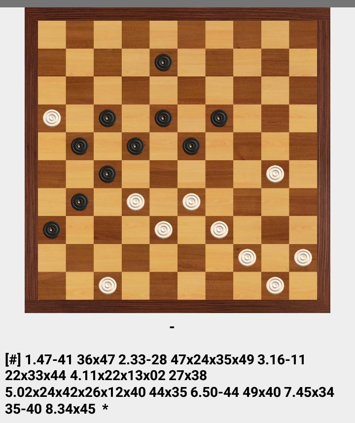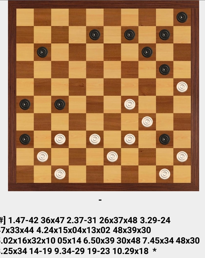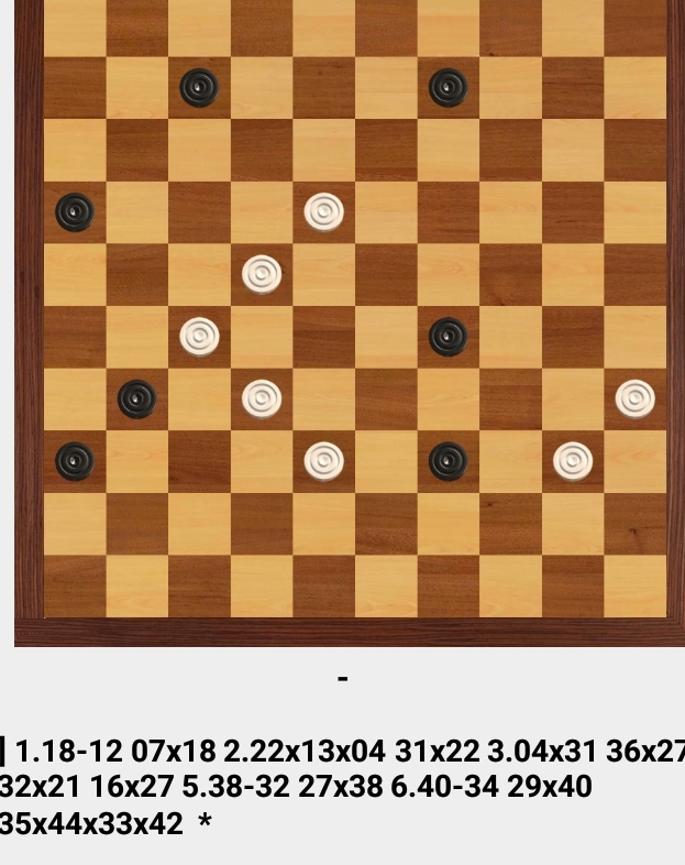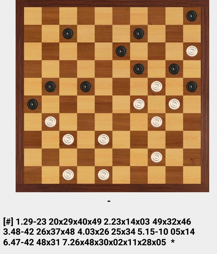 1.hg5 (f2) 2.g3 3.c7 [-futher "Dambrete" -1 -1963 *) the theoretical position from the debut with name " sacrifice of Kukuev "](d4) 4.d8 (bc3) 5.da5 6.ac3 7.hg3 x