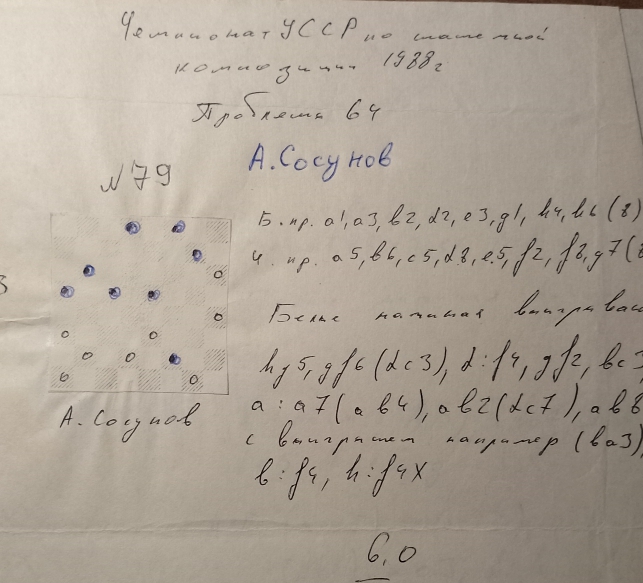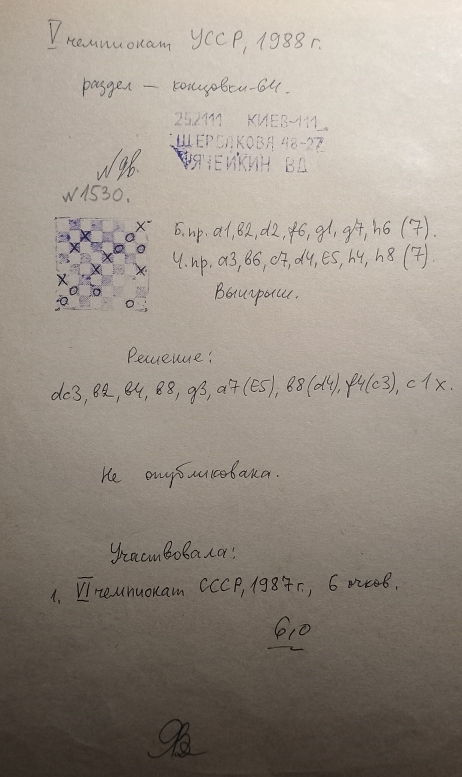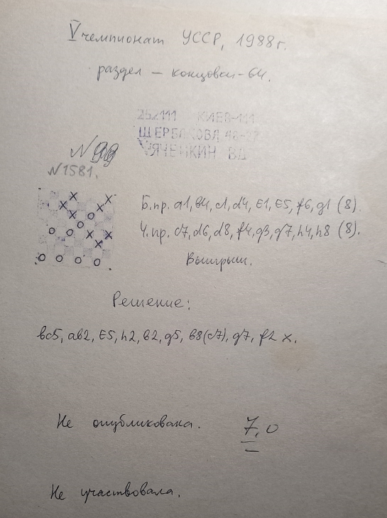 And here a scammer is trying to deceive the judges of the 14th Moscow Championship ,1987 by submitting an old work to the competition in violation of the competition's parliament.