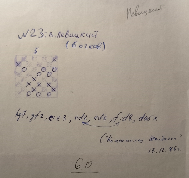 One well-known swindler isolated a fragment of this position's , which appeared after the first move gf6 in solution of this problem, and then brazenly attributed it to himself, clearly provoking conflict with the author of this problemy . He's probably never been punched in the face for such plagiarism.