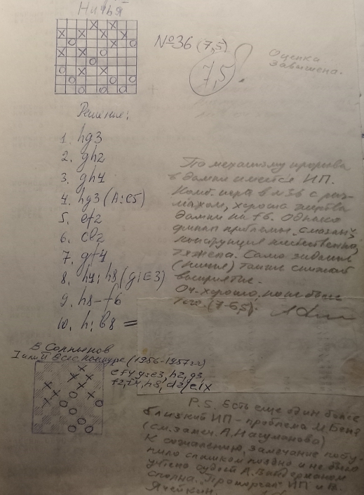 The « problema' » received a score of 7 points in the 6th USSR Championship (A. Winderman -7.5, M. Ben' -6.5, I. Bugaev -7.0)-comment by author of this post.