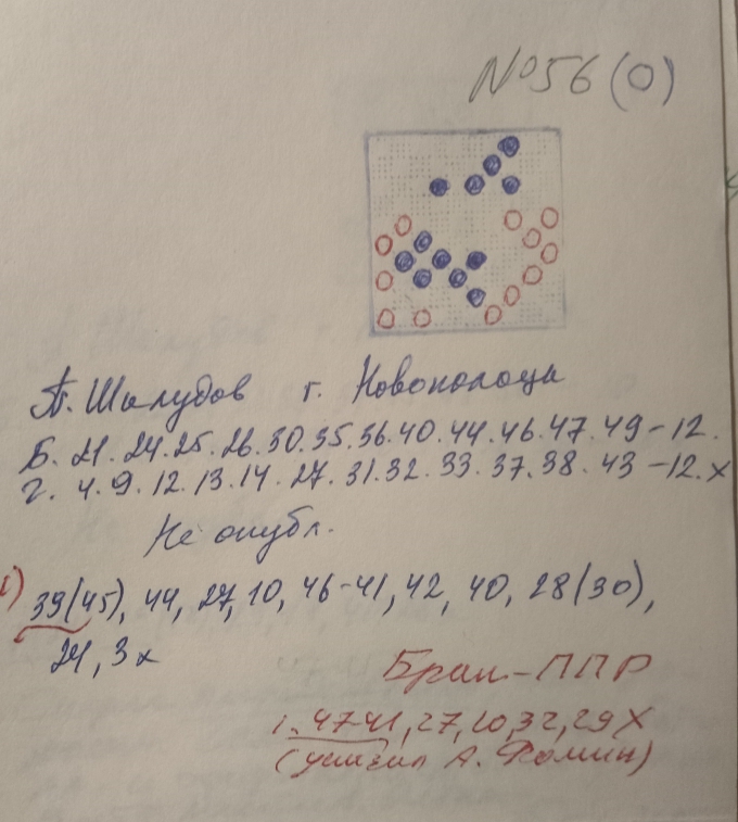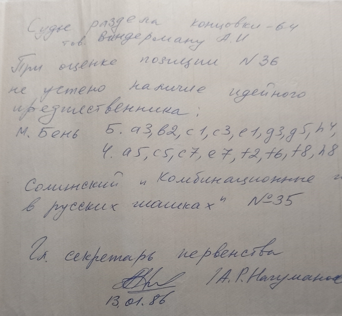 On January 13, 1987, the chief secretary of the 13th Moscow Championship on draughts composition , A. Nagumanov, wrote to judge A. Vinderman and chief judge A. Fedoruk::"when evaluating position No. 36, the presence of the ideological predecessor of M. Ben was not taken into account: see the book of S. Sominsky "Combination Ideas in Russian Checkers", No. 35; below is the chief secretary A. R. Nagumanov, signature."
