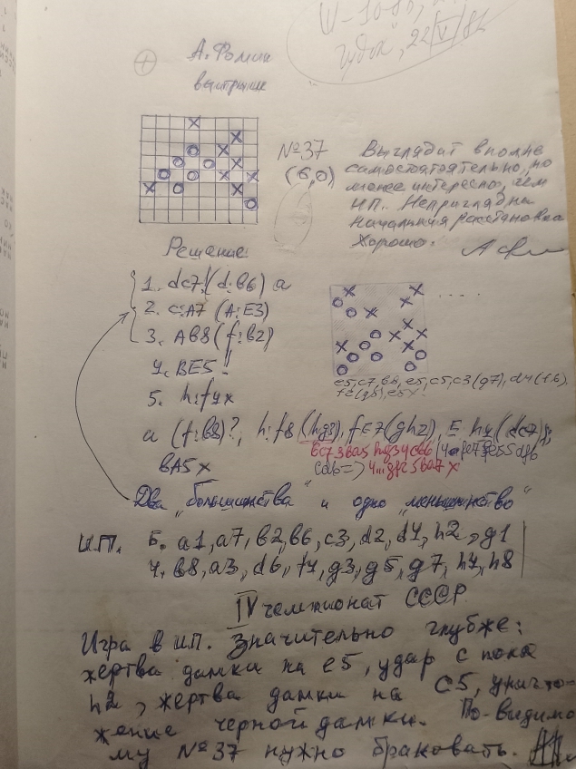 " By the mechanism of breakthrough into kings there is a predecessor . Combination play in No. 36 is on a grand scale, and the sacrifice of the king on the f6-cell is good. However, the finale of the "problem" " is "smeared." The checkers' construction is unnaturally bulkly. Very good (7-6, 5), but nothing more. Signature A. Fedoruk . "