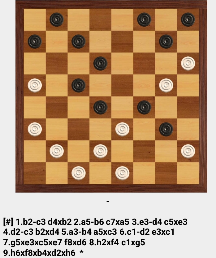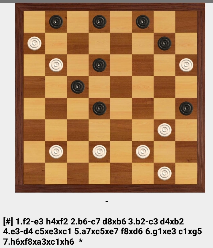 d2 (b2), d6, c3, e5, h6 (bc7), b8 (c7), g7 , hg3 (e5), gf4:, f2 x