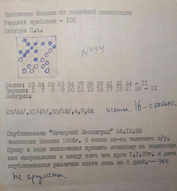 Fifteen years after the conclusion of the 2nd USSR Championship in Composition, by Trade Unions , Forger P. Shkludov did attempt to deceive in iinternet the public by claiming that his " problema ", submitted for participation in violation of regulations regarding publication deadlines, had a unique solution. In fact, this cheap product has no solution, but the judges did not check this possibility in 1989 : they rejected the attempt of " petitioner of alms" for violating of contest regulations .