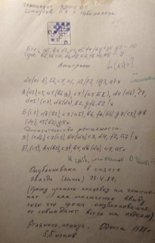 P. Shkludov, XIV-th Moscow championship on draughts composition , 1987(judge A. Vinderman)