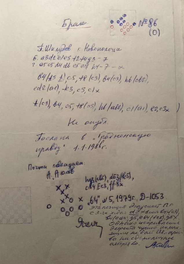 The plagiarist failed to appropriate this idea due to a primitive secondary solution in his childish work from the 12th Moscow Championship in 1985. There, the weakling and plagiarist received a slap in the face from the judges, and his attempt resulting in a score of 0 points.At that moment Mitrofanushka turned 25 years old, but in 10 years of studying composition he had not acquired any decency or intelligence.