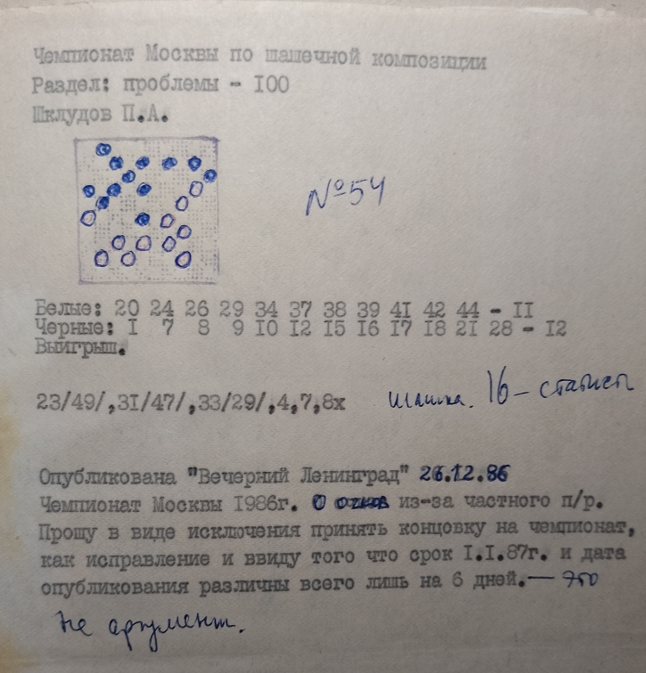 чемпионат Москвы 1986 г, оценка 0 очков из за частного побочного решения. Прошу в виде исключения принять концовку на чемпионат как исправление и ввиду того, что срок 1.01.87 г и дата опубликования различны всего лишь на 6 дней ".
