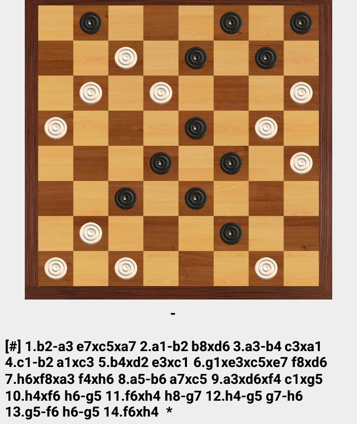 1.de3 a:c5 2.ab6 c:a7 3.e:c5 d:b4 4.gf4 e:e1 5.bc3 b:d2 6.gf2 e:g3 7.h:e1 ab6 8.ef2 ba5 9 fe1 x