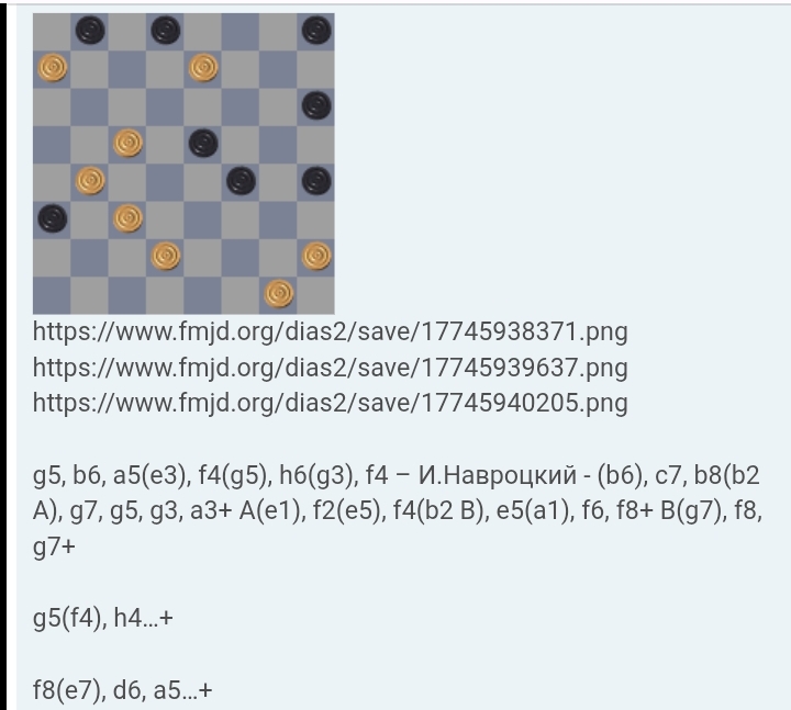 1.dc5 ! -further P. Shkludov fe3 2.d:f4 hg5 3.f:h6 hg3 4.h:f4 -futher I. Navrotsky : contest Odessa 1989-1990 cb6 5.a:c7 b::d2 6 .ab8 ab2 A 7.hg7 h:f6 8.fg5 f:h4 9.bg3 h:f2 10.g:a3 x A 6...de1 7.gf2 e:e5 9.b:f4 ab2 10.fe5 ba1 B 11.ef6 a:g7 12.h:f8 x B 10...bc1 11.ef4 c:g5 12.h:f4 x