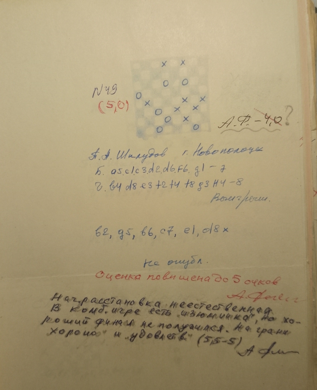 P. Shkludov , XII -th Moscow championship, 1985 , No. 49 ,score is 5 points ( main judge A. Fedoruk)