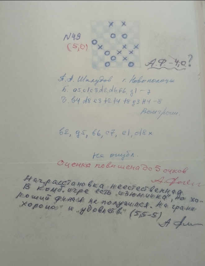 Only thirty years after the championship ended did the author of this post learn of the chief judge's change in his score. Of the six compositions submitted by 25-year-old weakling Dr. Bredov to the championship, not a single one was deemed worthy of score "good".