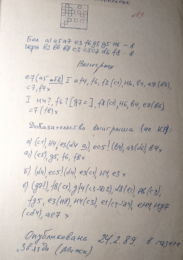 And in the 80s I filed documents for the title of CMS of the USSR, in the early 90s I was awarded the title of MS of Belarus, and somewhere in 2012-13 IM FMJD. A little later - around 2017-18 CPI awarded the title of grandmaster in checkers composition.