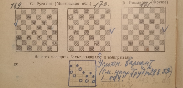 In S. Rusakov's composition, Vladimir Pin'zhenin moved the black checker " e1 " to the cell " c1 " and sent his "new creation" to the 16-th All Union Contest in 1977 (USSR), where he received a score of 0 points.