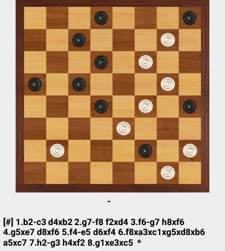 c3, f8, f6-g7 8: 6, e7, e5, b6, b6, g3, c5 x