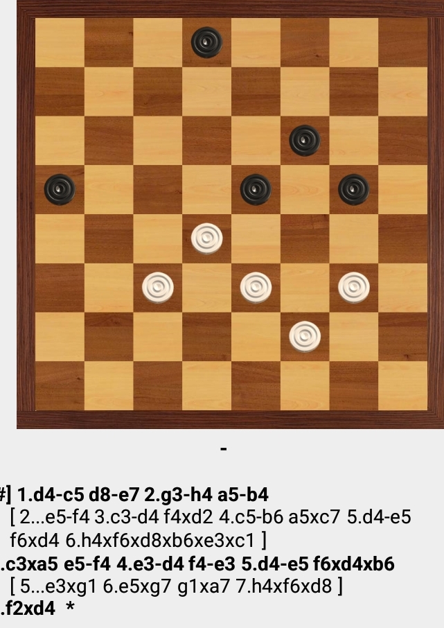 The game played out: 1.dc7 ed6 2.c:g7 f:h6 3 . ef2 and Kadumov resigned without playing out the game. After the game, it turned out that White could had his own win differently: 1.ed2 2.a:g7 2.b4:3.ab4 5.h:d8 x ( There was pointed out by Sh. Kadumov) .