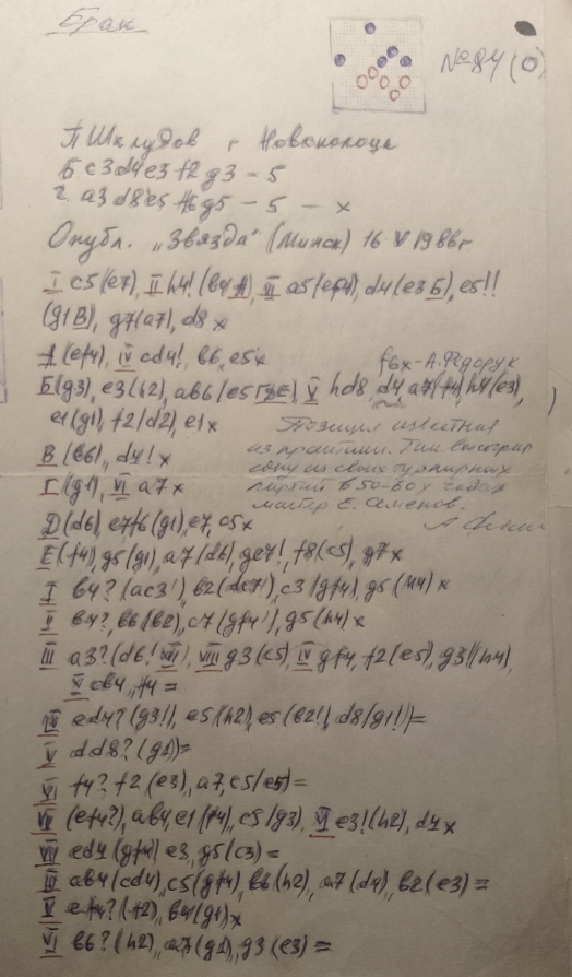 чемпионат Москвы 1986 г, оценка 0 очков из за частного побочного решения. Прошу в виде исключения принять концовку на чемпионат как исправление и ввиду того, что срок 1.01.87 г и дата опубликования различны всего лишь на 6 дней ".
