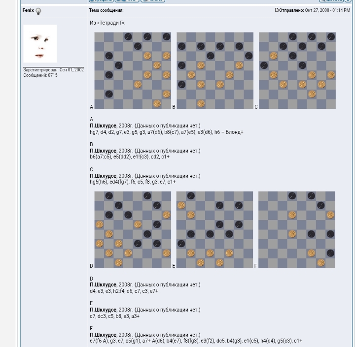 Миша, но написанное выше – это не мемуары. Я просто не готов продолжать… Всё очень сложно. Всё переплелось. Не могу отделить жизнь от шашек и шашки от жизни. Да и начал-то я, получается, с середины… Но – поживем еще! Fenix :
