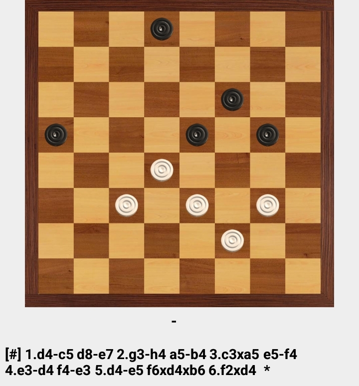 1.ed4 c:a3! 2.dc5 d:b4 3.a:a1 cb6 4.dc3 ba5 5.cd4 ed6 6.