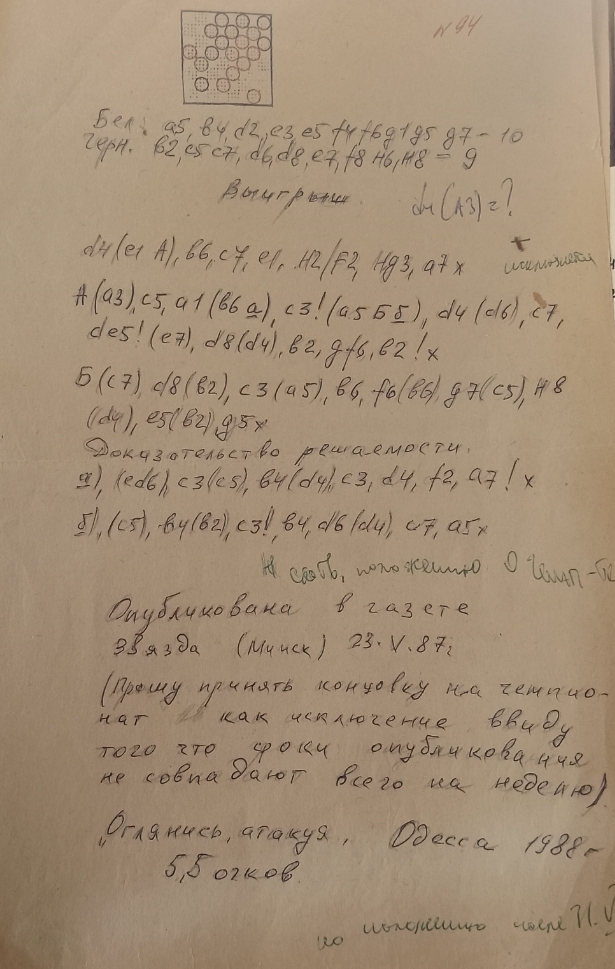 Ps: Based on a number of provided evodence , we come to a conclusion that will disappoints today's critic.During three decades, having become a mediocre example for drafts players , the" orderly of the forest " chased after the chimera.He tried to become a master of drafts composition in the USSR, but unsatisfactory practical training and inability to analyze repeatedly let down the unsuccessful contender for the title of master.